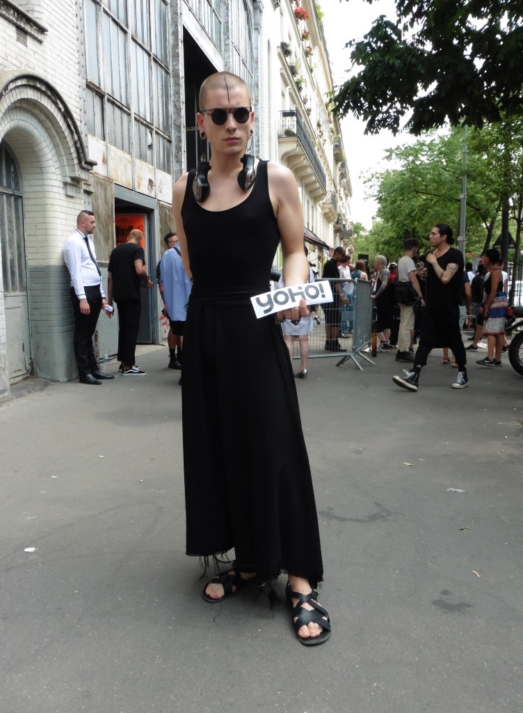 DEFILE RYNSHU SUR LA TERRASSE DE L’HOTEL MEURICE: Pour cette saison le créateur japonais Masatamo Yamashi qui a pour habitude de chercher son inspiration dans la contemplation du modernisme japonais y ajoute une touche de romantisme. Cette collection androgyne se décline ainsi en pantalons en tissu de kimonos traditionnels vintage, en manches de chemises qui deviennent romantiques grâce à une technique de drapé en volume, en un mélange savant d’imprimés floraux et graphiques, en broderies aux motifs de phoenix ornant vestes, blousons, manteaux, pantalons et chemises, en messages japonais brodés en violet sur des écussons noirs et blancs, en kanjis (caractères utilisés dans l’écriture du japonais) exprimant la volonté de réalisation des souhaits ou de succès dans les affaires. Pour ce qui est des matières: cotonnade faite main avec une technique de « collage », noire et blanche, soie aérienne et transparente imprimée de motifs pastels ou de dessins inkjet de fleurs colorées, association d’organdi noir ultra-fin et d’un lamé chatoyant. Les silhouettes sont finalisées avec des chapeaux et foulards qui invitent à une rêverie toute romantique.
