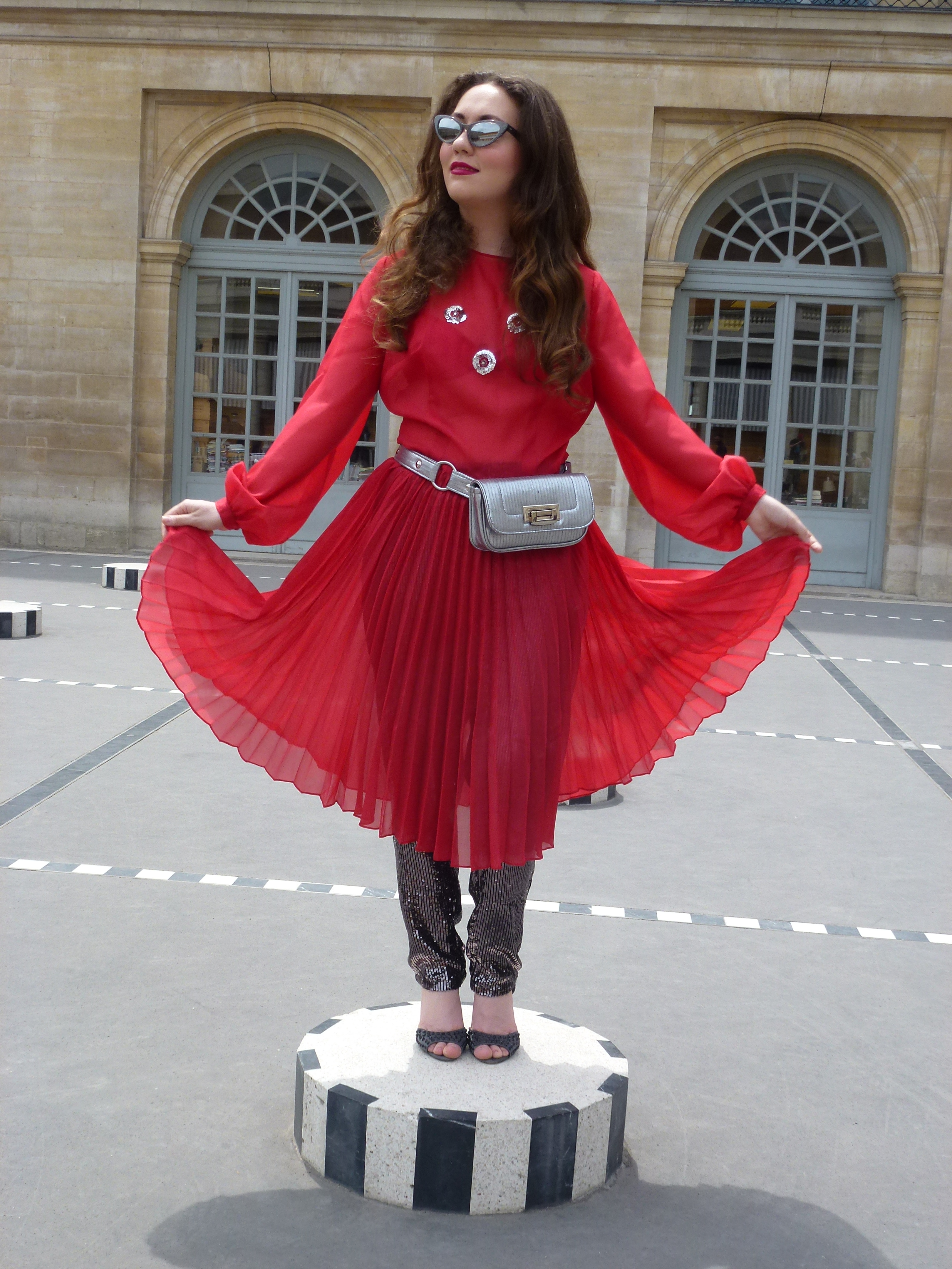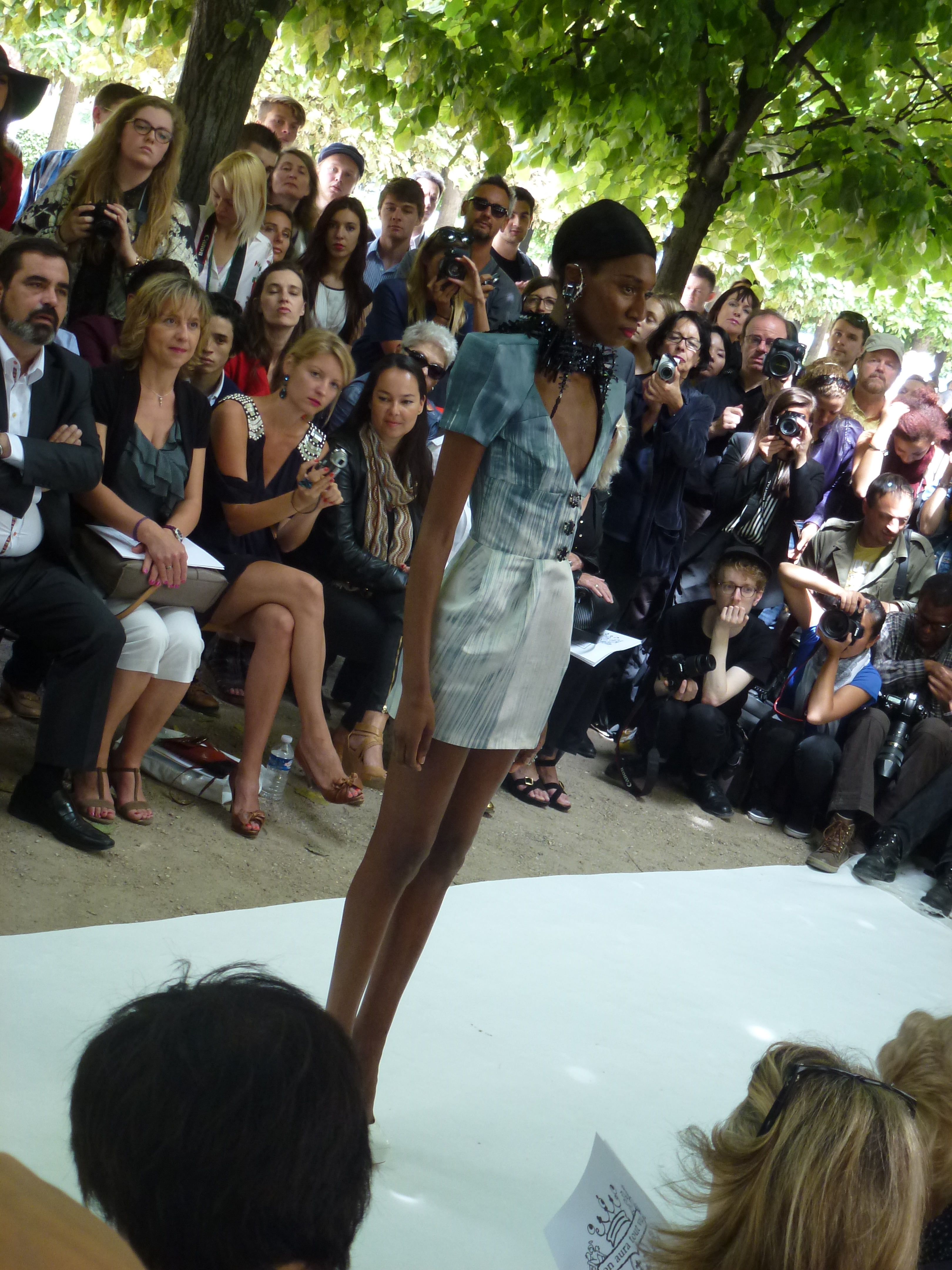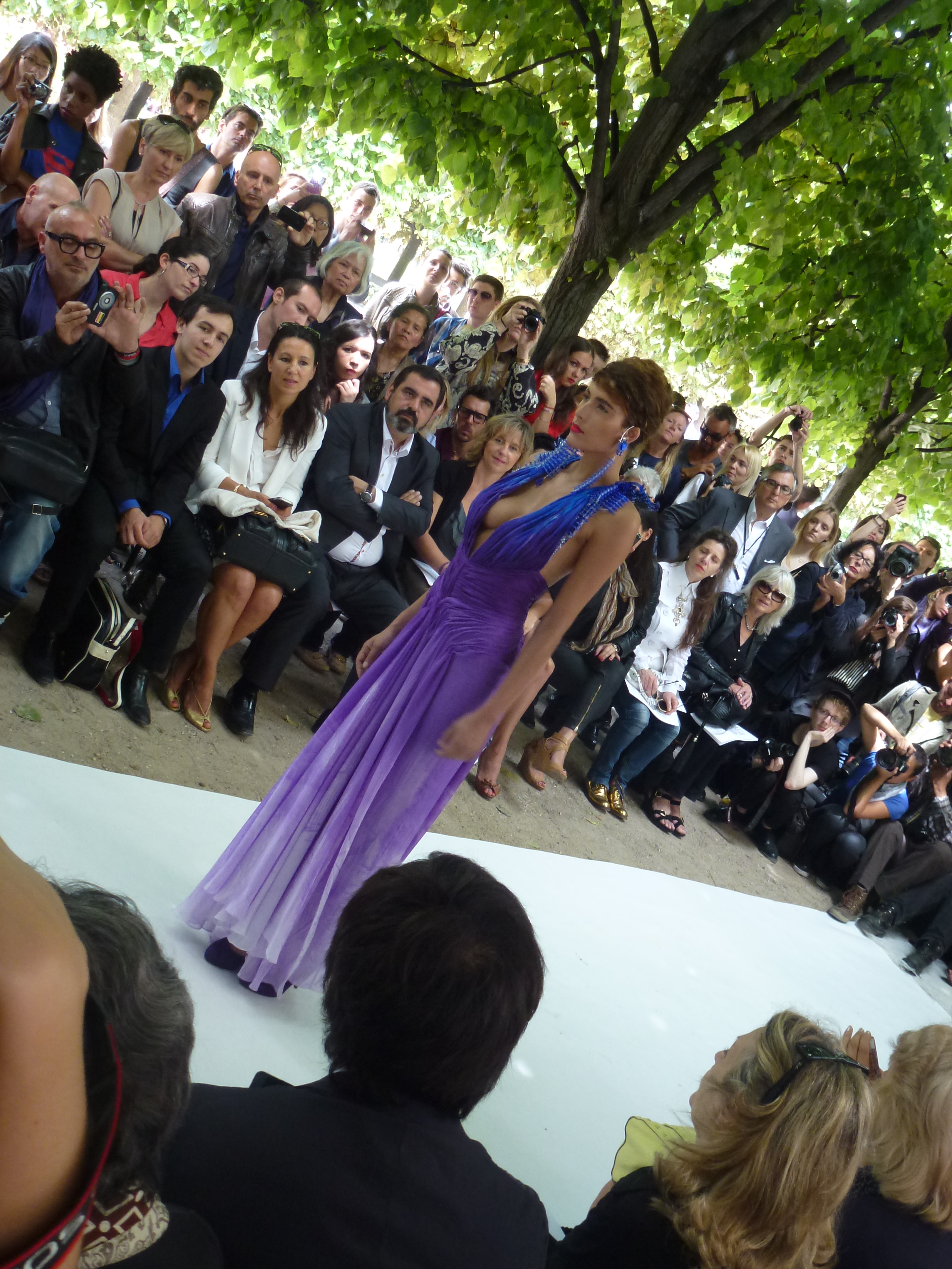 J’ai pu assister au défilé « On Aura Tout Vu » qui se tenait en plein air dans les Jardins du Palais Royal (excellente idée, ce qui permettait au public de le voir): une collection somptueuse mêlant tradition et innovation: