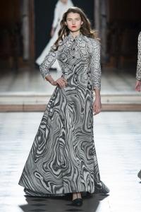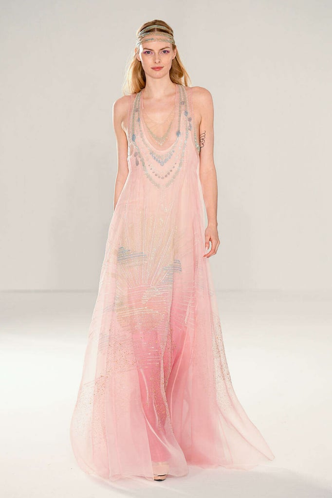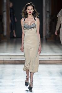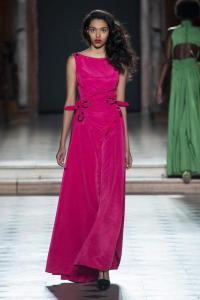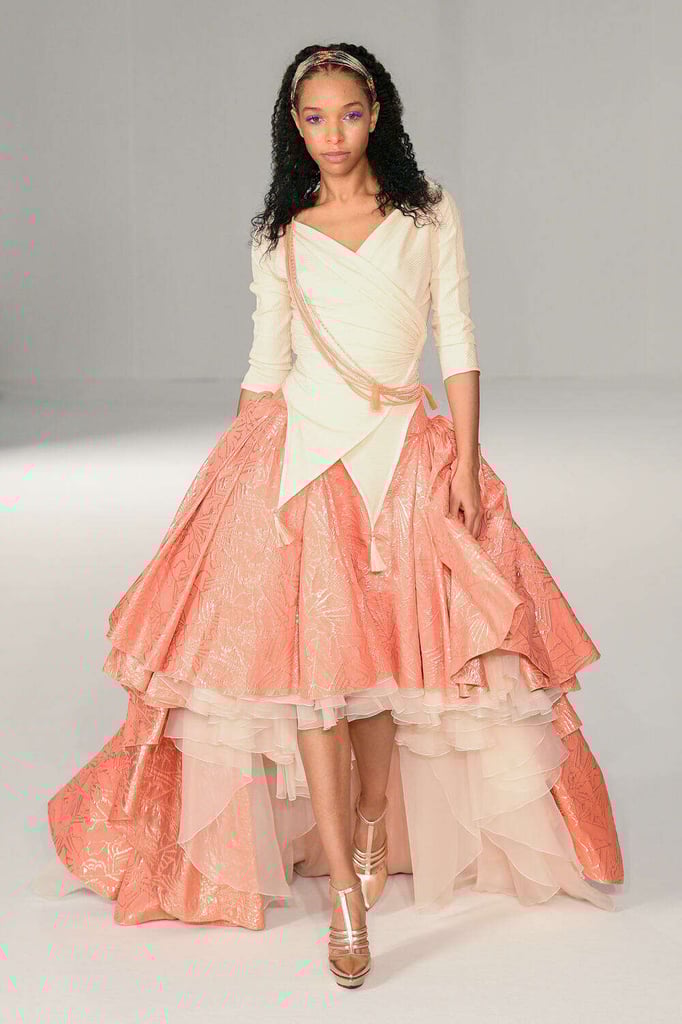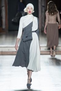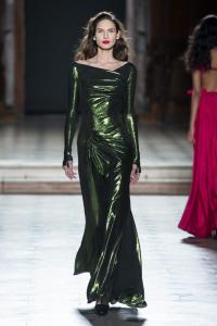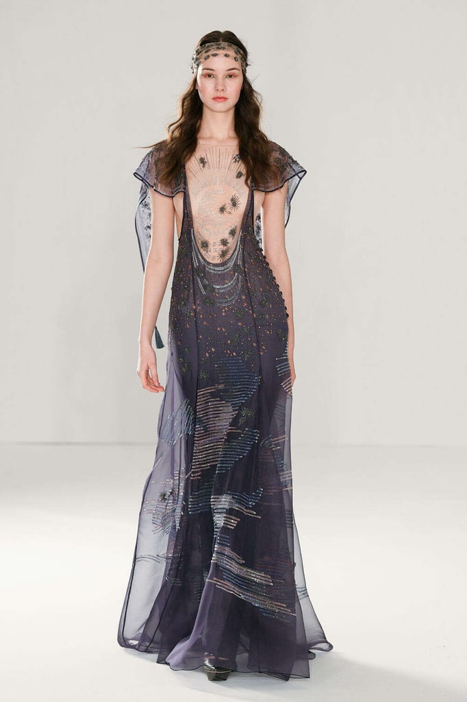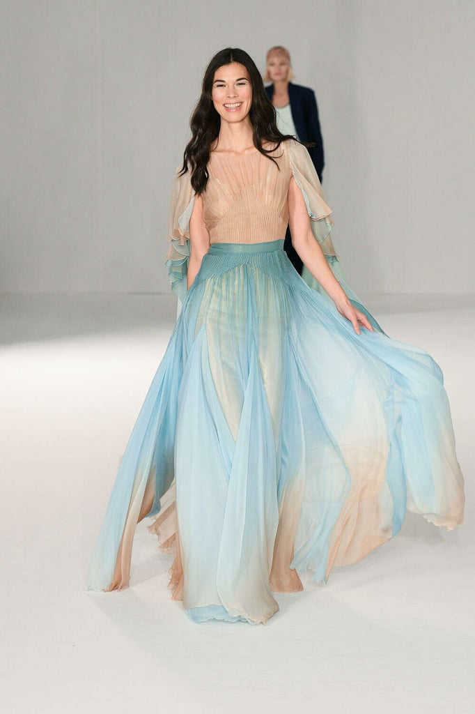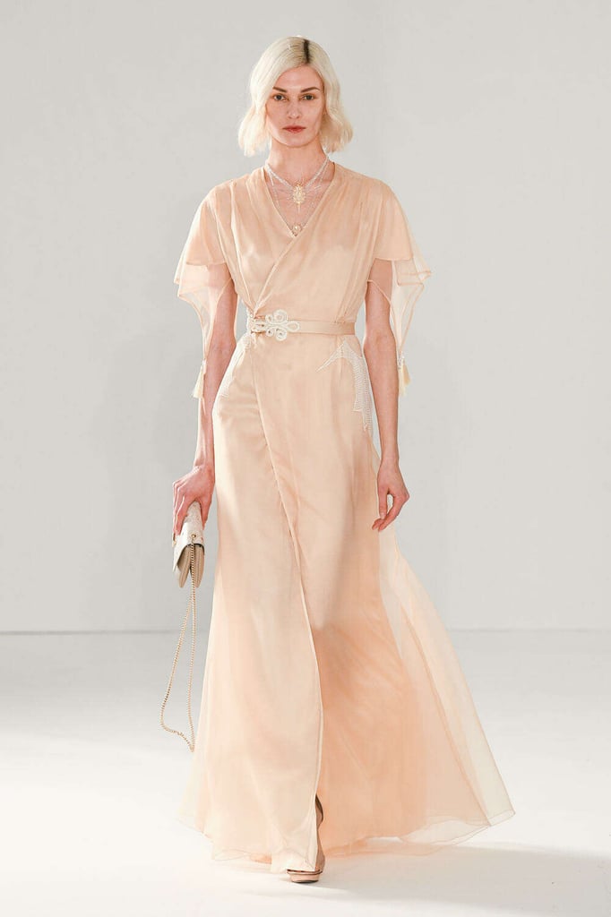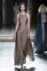 DEFILE JULIEN FOURNIE A LA SALLE GAVEAU: Le couturier français a présenté une collection innovante, célébrant une liberté féminine post-covid qui s’affranchit du soutien-gorge. Les tenues se veulent donc « plus légères, plus caressantes, moins près du corps », selon ses déclarations. Le défilé s’ouvre avec un tailleur pantalon blanc oversize brodé de fils d’or et des rubans portés en bandeau sur des cheveux relâchés. Pour les looks suivants les encolures et les emmanchures évoquent le débardeur, les petites robes en jersey sont un clin d’oeil à la grande couturière Madeleine Vionnet, un maillot de bain entièrement brodé devient une tenue de soirée. L’absence de maintien par le soutien-gorge conduit à repenser le modélisme des robes, notamment avec une taille un peu remontée pour affiner la silhouette. Dans une robe bleu clair l’effet « années 30 » est obtenu grâce au contre-balancement sous le poids de la broderie d’un pan de tissu ramené de l’avant sur le dos. Les boléros amènent une manche très loose et cachent le bras. Les transparences maintiennent le côté sexy. Rose pâle, orange, nuit violacée: les couleurs des robes et les broderies réalisées par l’atelier indien Shanagar évoquent des couchers et levers de soleil.