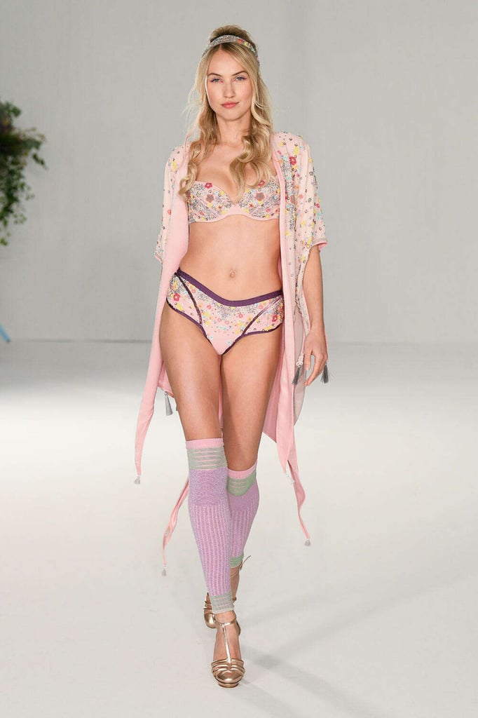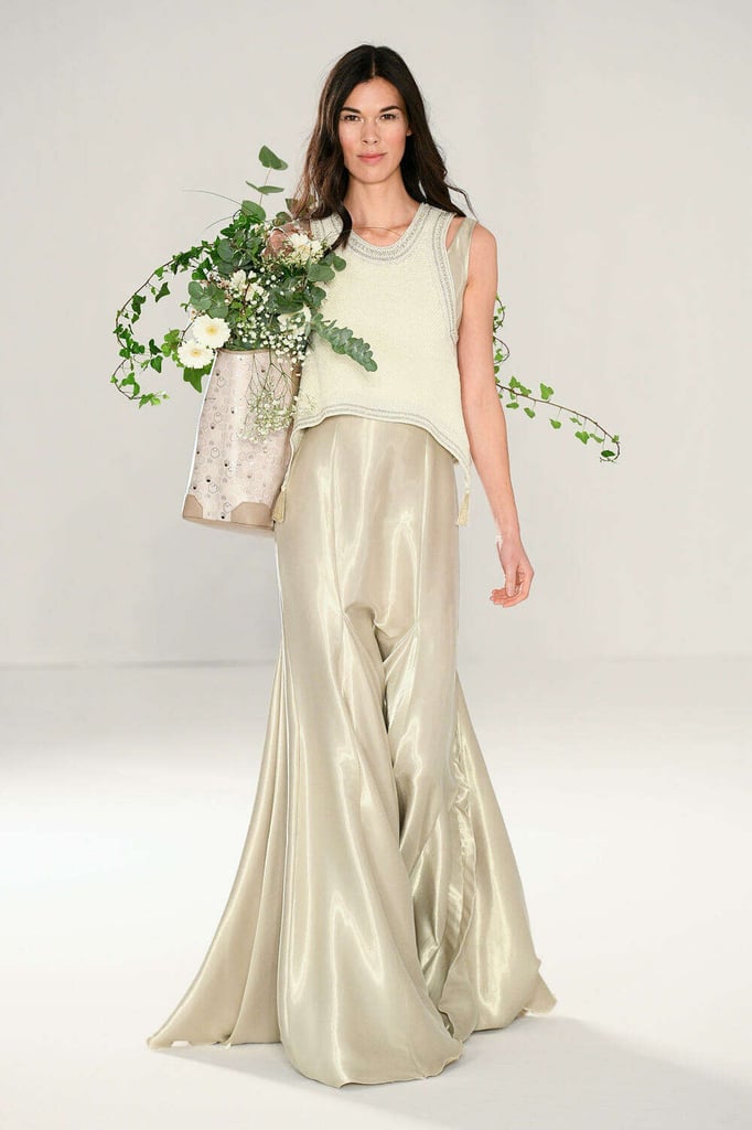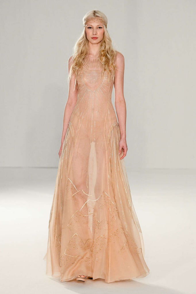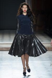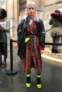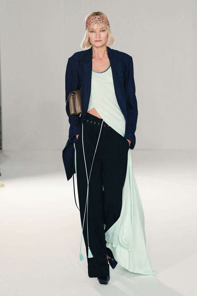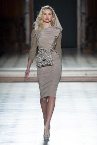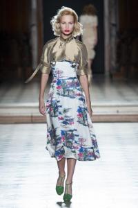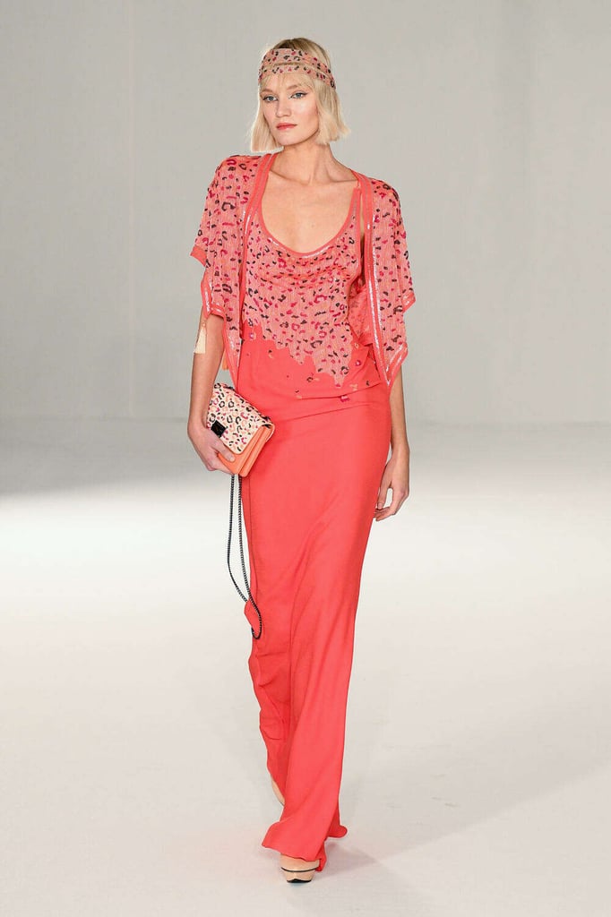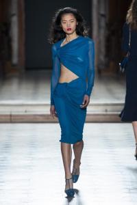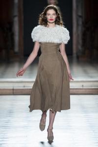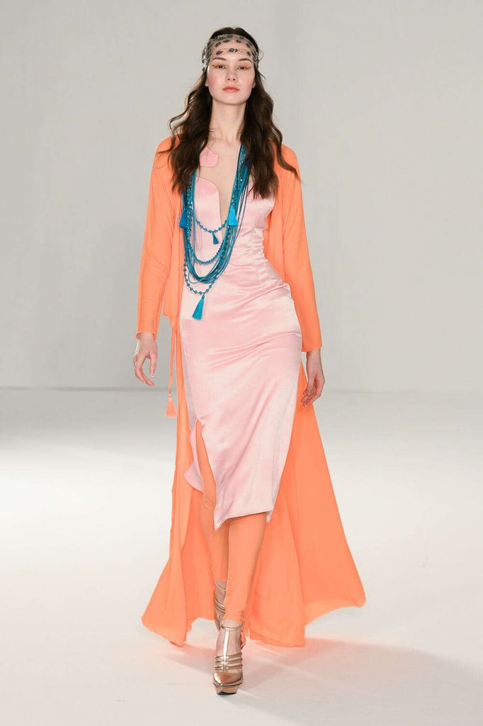 DEFILE JULIEN FOURNIE A LA SALLE GAVEAU: Le couturier français a présenté une collection innovante, célébrant une liberté féminine post-covid qui s’affranchit du soutien-gorge. Les tenues se veulent donc « plus légères, plus caressantes, moins près du corps », selon ses déclarations. Le défilé s’ouvre avec un tailleur pantalon blanc oversize brodé de fils d’or et des rubans portés en bandeau sur des cheveux relâchés. Pour les looks suivants les encolures et les emmanchures évoquent le débardeur, les petites robes en jersey sont un clin d’oeil à la grande couturière Madeleine Vionnet, un maillot de bain entièrement brodé devient une tenue de soirée. L’absence de maintien par le soutien-gorge conduit à repenser le modélisme des robes, notamment avec une taille un peu remontée pour affiner la silhouette. Dans une robe bleu clair l’effet « années 30 » est obtenu grâce au contre-balancement sous le poids de la broderie d’un pan de tissu ramené de l’avant sur le dos. Les boléros amènent une manche très loose et cachent le bras. Les transparences maintiennent le côté sexy. Rose pâle, orange, nuit violacée: les couleurs des robes et les broderies réalisées par l’atelier indien Shanagar évoquent des couchers et levers de soleil.