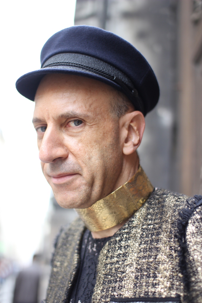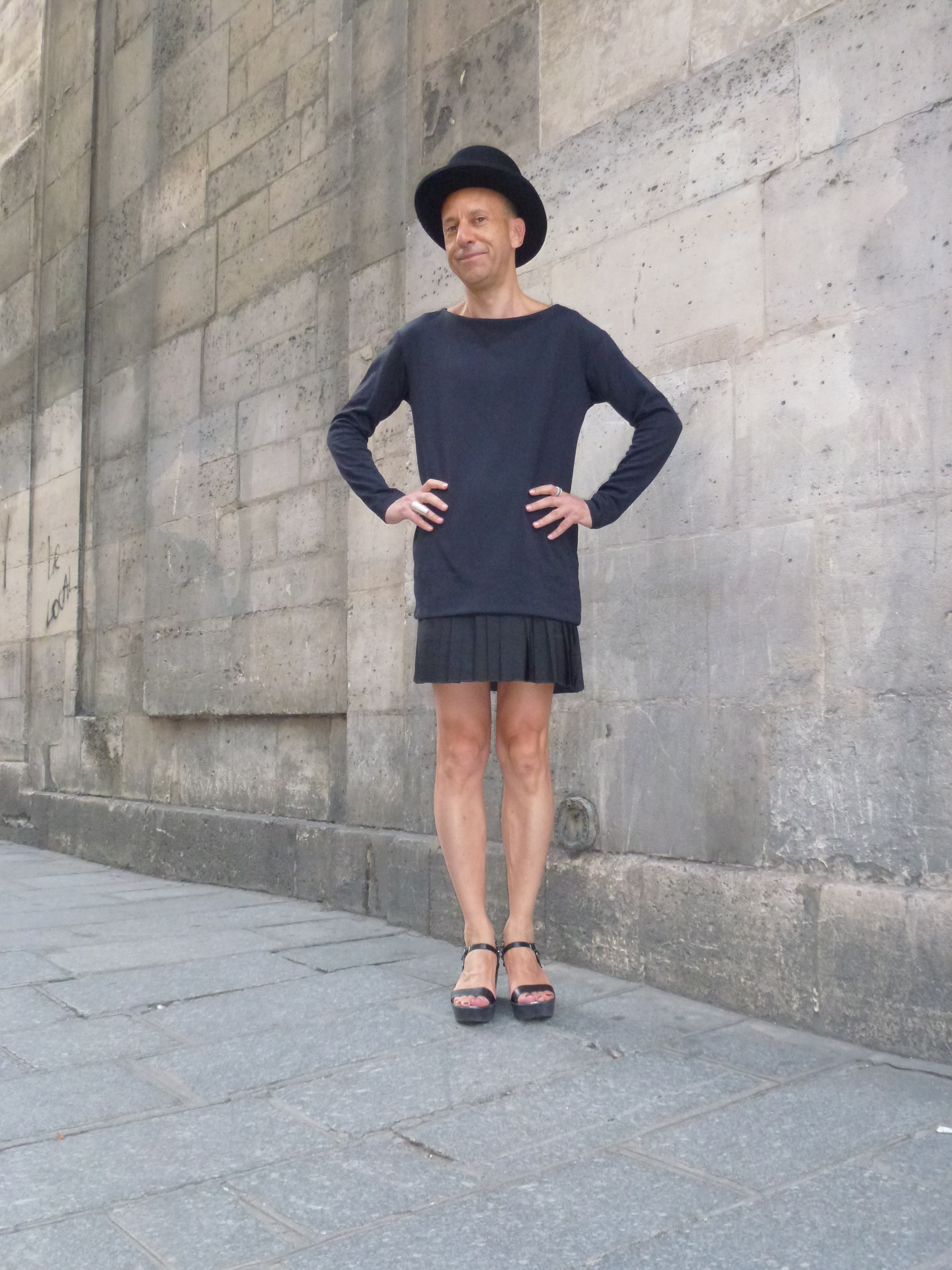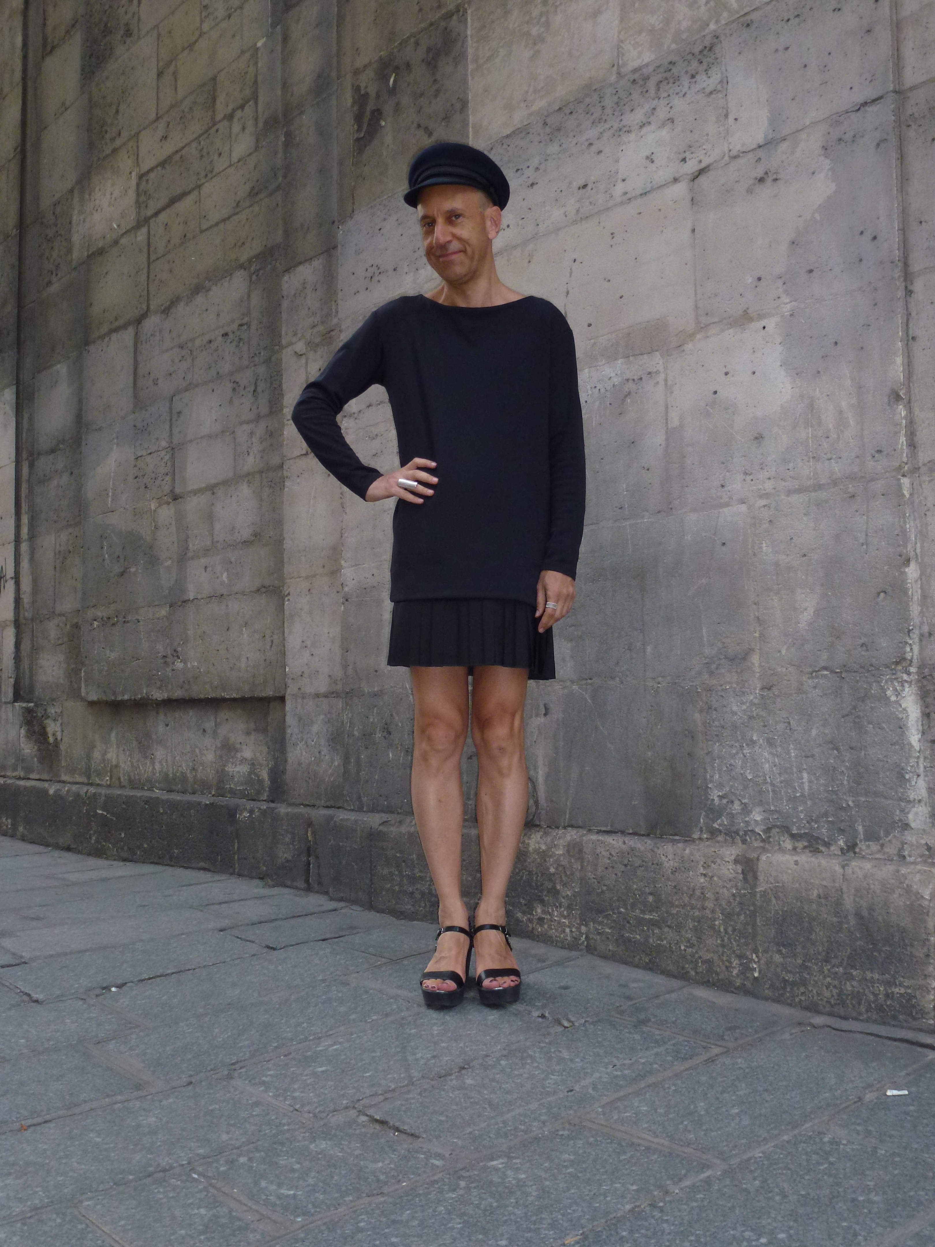 robe: Mary Meyer (chez Simonne & Lisa b – Paris 3ème); veste smoking: Sandro; collier: Satellite Bijoux; casquette: Les Canotiers du Marais; manchette: Clara Jasmine Bijoux; sac: vintage; boots: Lola Espeleta.
