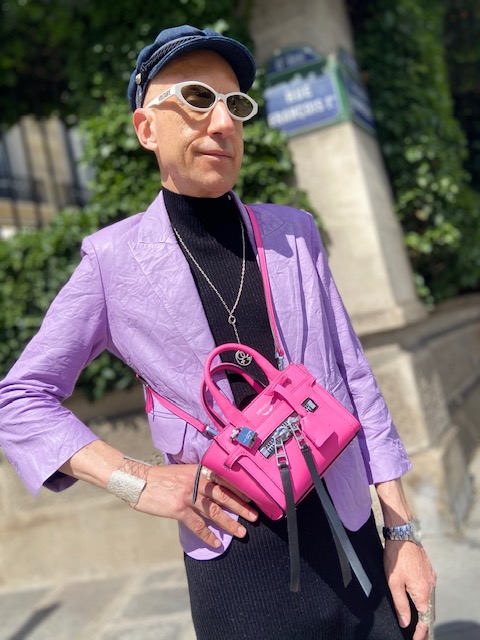 Qu’on se le dise: le mauve est la couleur phare de cet été! Il se combine avantageusement avec du noir, mais aussi avec du rose pour une touche plus fun. La plupart des pièces de ce look détonant proviennent de la collection Zadig&Voltaire été 2020: veste courte en cuir froissé « Valdy »; robe « Myria » en laine mérinos à manches courtes, dos nu et agrémentée de boutons en forme de coeurs, étoiles et fleurs sur l’épaule; petit sac rose fluo en cuir porté en bandoulière « Candide Nano Zip »; sneakers à grosses semelles « Future »; casquette en jean « Navy » et lunettes blanches très tendance (collections antérieures). Pour le reste: chaîne en argent Clio Blue, manchette et bagues en métal argenté Clara Jasmine, soquettes American Apparel