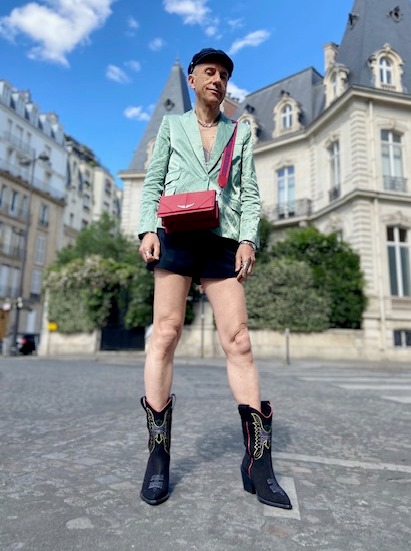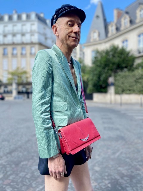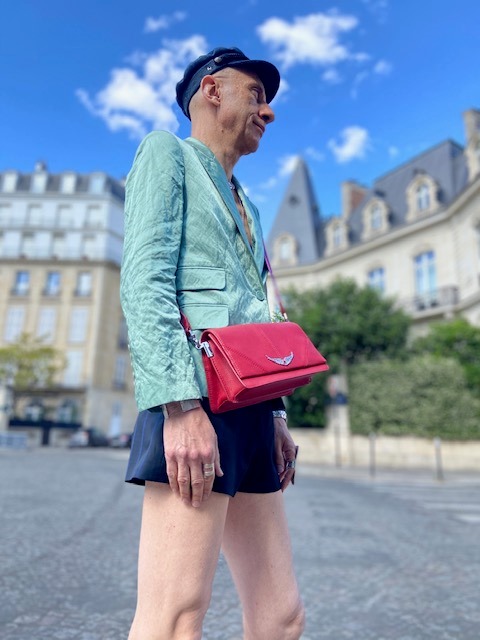 Elegance en vert pour ce nouveau look, et une combinaison peu usuelle de vert, rouge, bleu et noir qui fonctionne très bien! Veste verte en coton aspect froissé « Victor satin », caraco gris agrémenté de strass « Marga Strass », short noir avec fines rayures bleues et garni d’imprimés jacquard « Pink », bottes en cuir avec surpiqûres colorées (rouge/doré) « Rockland suede », le tout collection Zadig&Voltaire été 2020; casquette « Navy » en jean et petit sac rouge en cuir Zadig&Voltaire (collections antérieures); collier ras du cou et chaîne en argent Clio Blue; manchette et bagues en métal argenté Clara Jasmine.