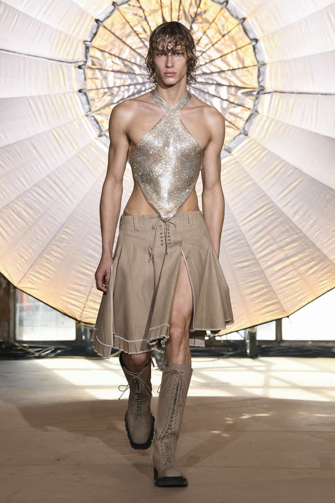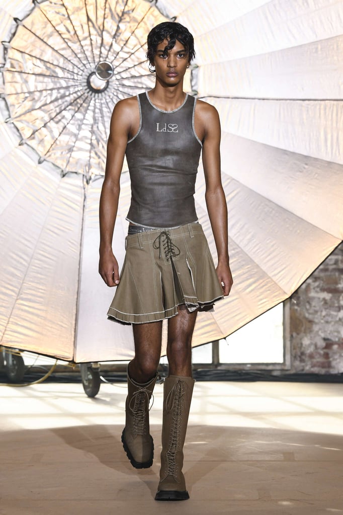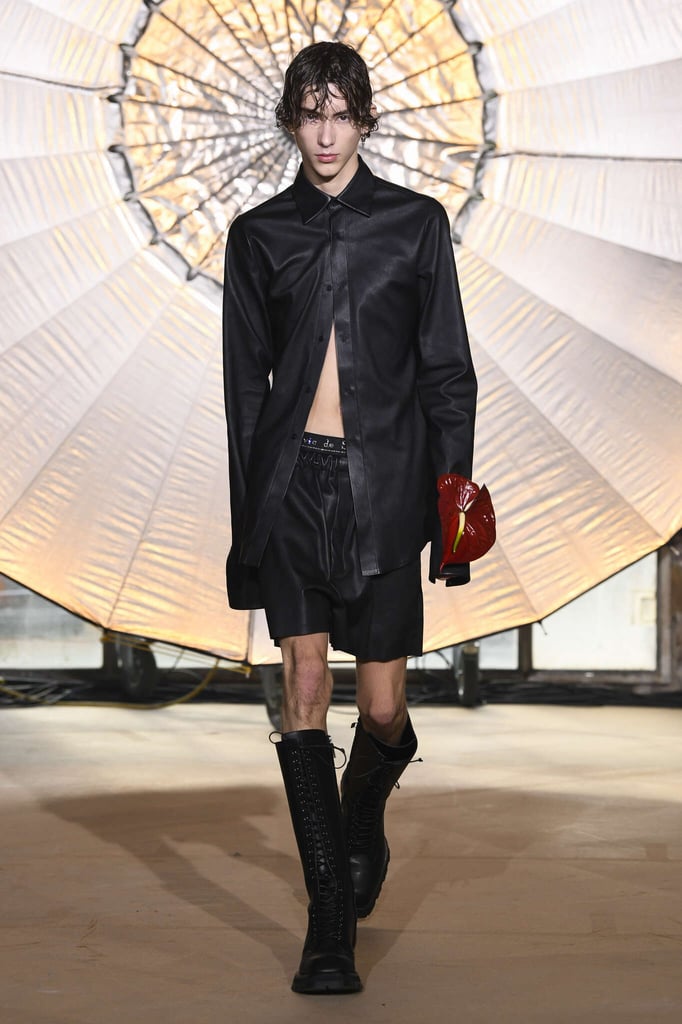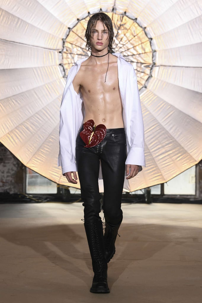 DEFILE LUDOVIC DE SAINT SERNIN DANS UN IMMEUBLE EN TRAVAUX: Pour fêter le cinquième anniversaire de sa marque fondée en 2017 le jeune créateur parisien a proposé une nouvelle collection parfaitement mixte jouant comme à son habitude avec les codes érotiques. Les hommes prennent des allures de légionnaires romains sensuels et virils, tandis que les femmes apparaissent en tenues très déshabillées. Bottes lacées en cuir hautes et plates et jupettes à bandelettes, surmontées d’un ceinturon clouté, constituent la base de l’uniforme. La jupe de centurion est aussi déclinée en slip de cuir clouté et frangé, ou en top à bretelles évasé à gros plis, dont le modèle identique se traduit pour la femme par une mini robe, ou encore en minijupe de toile kaki. Un anthurium (plante tropicale) écarlate avec son pistil jaune, retenant un top à une épaule ou accroché au poignet en bracelet, attire les regards. Les mises en cuir hyper moulantes (fourreau bustier, shorts, débardeurs, pantalons) sont toujours très présentes, tout comme les transparences dans un voile en tulle drapé sur le corps et des tricots fins. Pour le soir, les hommes portent des pantalons entièrement lacérés, laissant deviner la rondeur de leur fesses, tandis que les femmes se parent de lumière avec des ensembles en maille de cristaux Swarovski scintillante, des robes ou des minijupes drapées assorties à leur soutien-gorge.