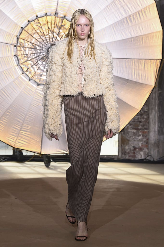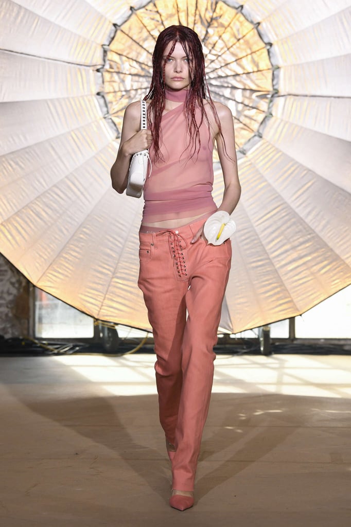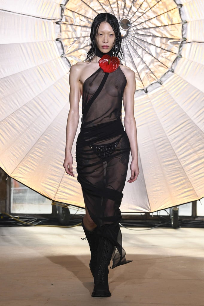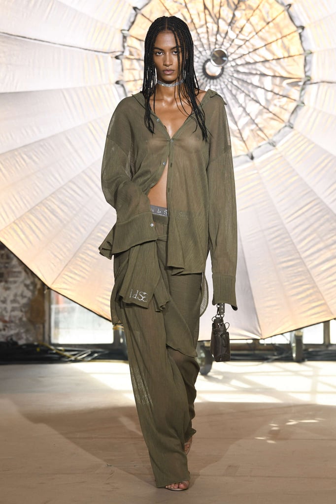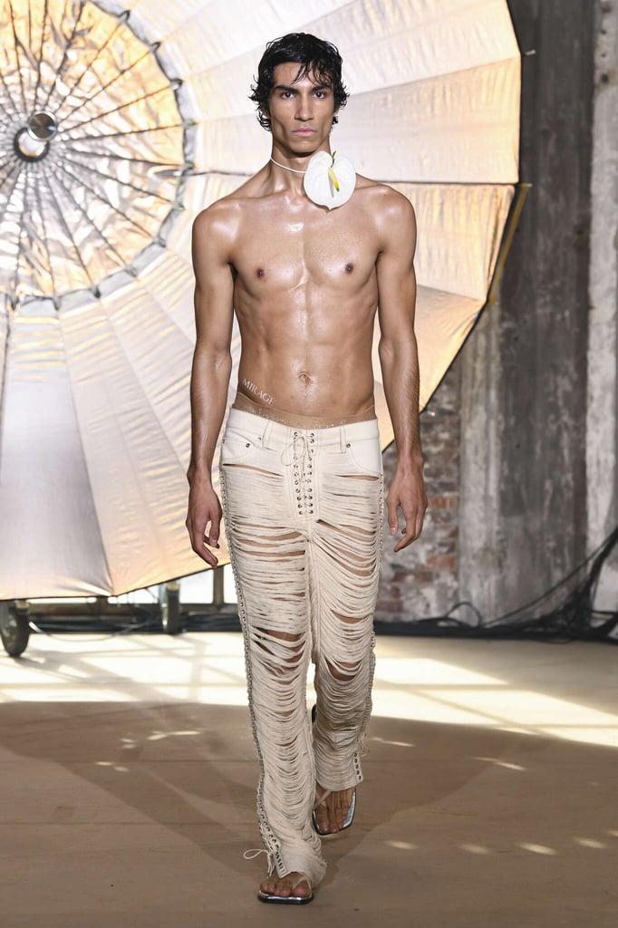 DEFILE LUDOVIC DE SAINT SERNIN DANS UN IMMEUBLE EN TRAVAUX: Pour fêter le cinquième anniversaire de sa marque fondée en 2017 le jeune créateur parisien a proposé une nouvelle collection parfaitement mixte jouant comme à son habitude avec les codes érotiques. Les hommes prennent des allures de légionnaires romains sensuels et virils, tandis que les femmes apparaissent en tenues très déshabillées. Bottes lacées en cuir hautes et plates et jupettes à bandelettes, surmontées d’un ceinturon clouté, constituent la base de l’uniforme. La jupe de centurion est aussi déclinée en slip de cuir clouté et frangé, ou en top à bretelles évasé à gros plis, dont le modèle identique se traduit pour la femme par une mini robe, ou encore en minijupe de toile kaki. Un anthurium (plante tropicale) écarlate avec son pistil jaune, retenant un top à une épaule ou accroché au poignet en bracelet, attire les regards. Les mises en cuir hyper moulantes (fourreau bustier, shorts, débardeurs, pantalons) sont toujours très présentes, tout comme les transparences dans un voile en tulle drapé sur le corps et des tricots fins. Pour le soir, les hommes portent des pantalons entièrement lacérés, laissant deviner la rondeur de leur fesses, tandis que les femmes se parent de lumière avec des ensembles en maille de cristaux Swarovski scintillante, des robes ou des minijupes drapées assorties à leur soutien-gorge.