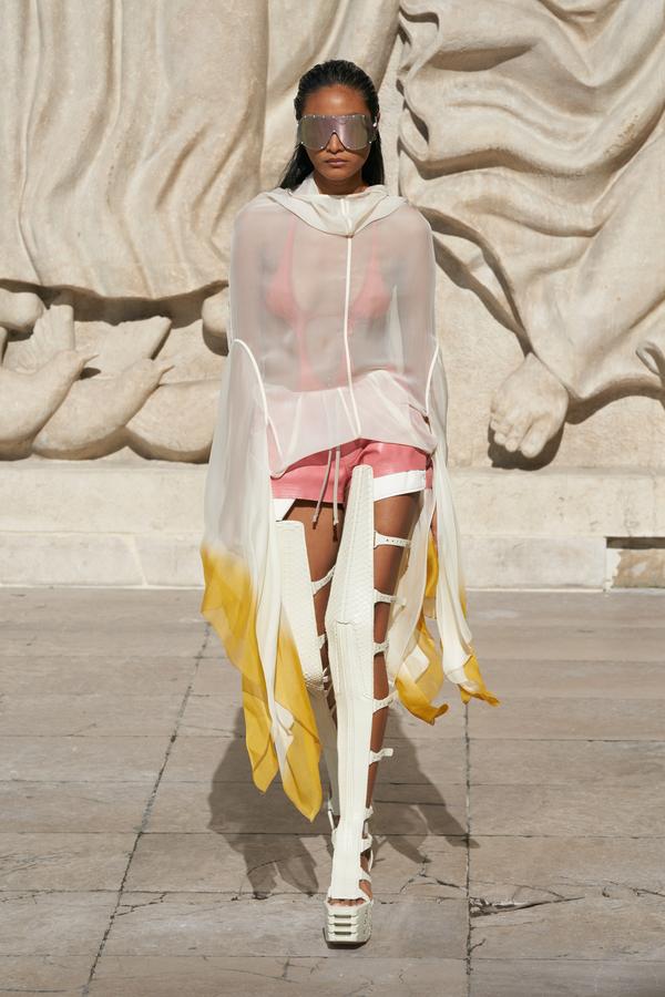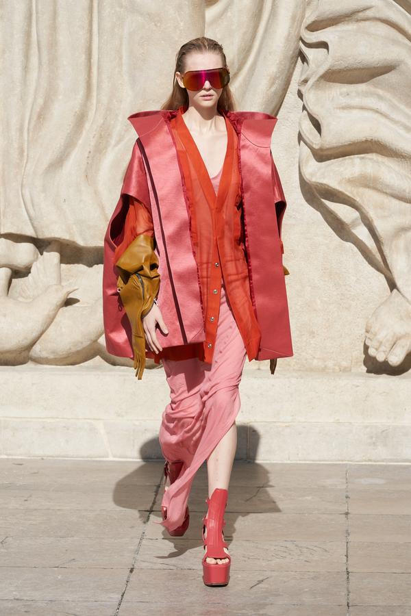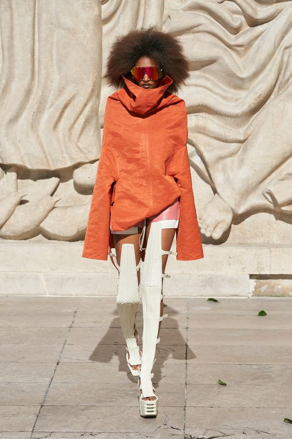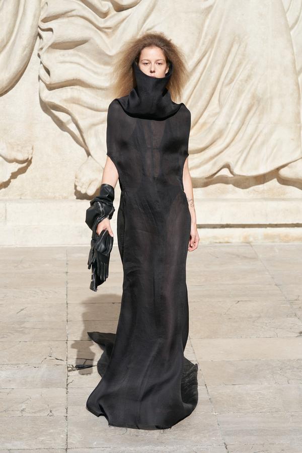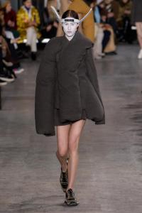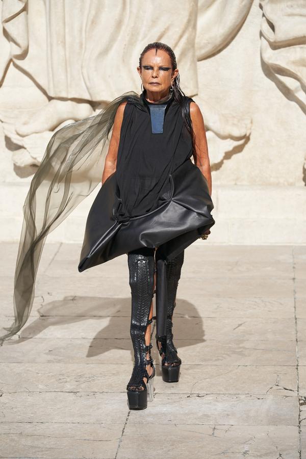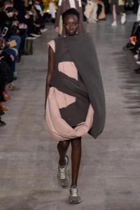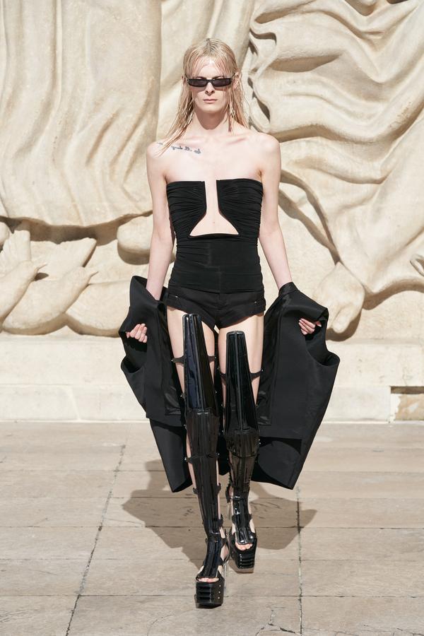 DEFILE RICK OWENS AU PALAIS DE TOKYO: Le designer américain a proposé un spectacle dont il a le secret, d’une grande théâtralité, avec une certaine poésie gothique et de nombreuses références à sa nouvelle patrie hivernale, l’ancienne ville de Louxor en Egypte. Sa muse, Tyrone Dylan, a ouvert le défilé chaussé de cuissardes en cuir noir avec des talons à plateformes, portées avec un short et une cape de vampire laissant voir une bonne partie de son torse aux muscles parfaitement dessinés. Les cuissardes se trouvent également sur les looks suivants, souvent associées à des gilets sans manches matelassés aux épaules très larges. Fidèles à son ADN, on retrouve tout au long du défilé, en noir dominant mais pas que, des proportions exagérées, des silhouettes frappantes, des justaucorps et manteaux gothiques à épaules pagode, des capes tourbillonnantes, une série de vestes aviateur oversize, des blousons à épaules en pointe et d’immenses couvertures matelassées en cuir épais, attachées à la manière de sculptures modernistes.