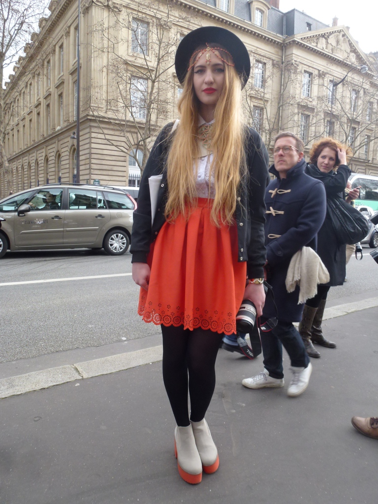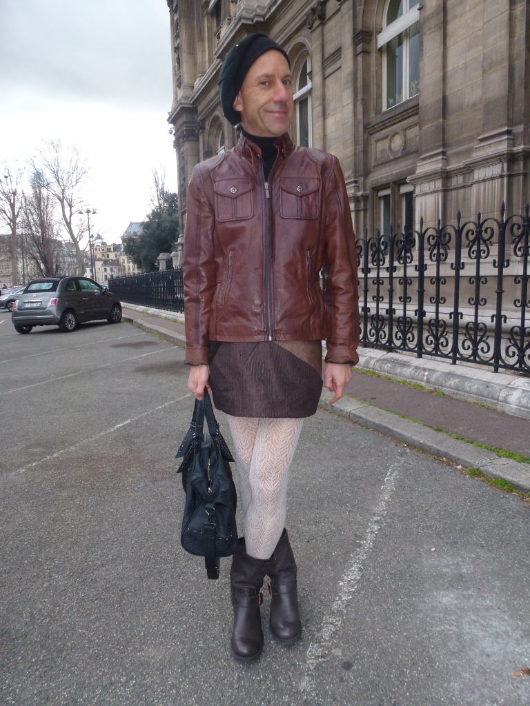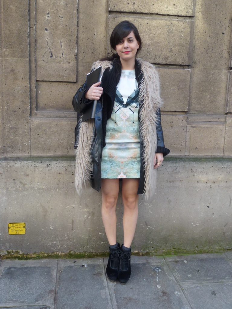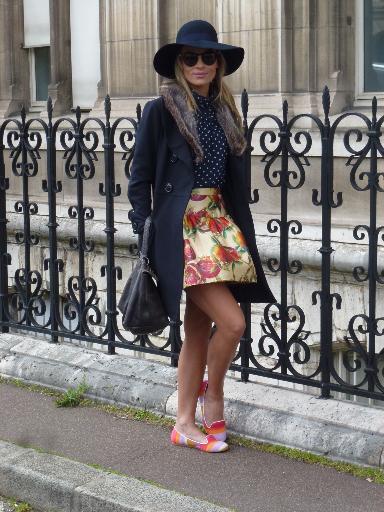 Veste: Ysterike; short noir moulant avec sequins: Molly Bracken (chez Citadium); casquette: Les Canotiers du Marais; collant résille: Tabio; chaussures: Vagabond (je suis vraiment fan de cette marque suédoise à prix abordables qu’on trouve chez Citadium: ils ont plusieurs modèles avec des talons assez hauts mais larges, et donc très confortables pour marcher).