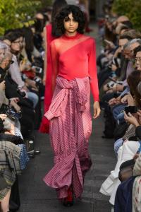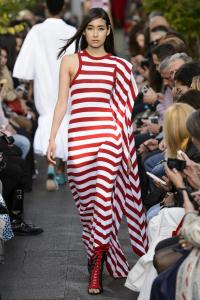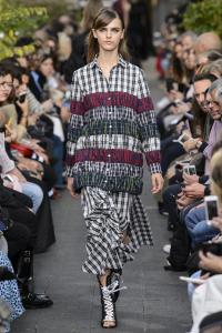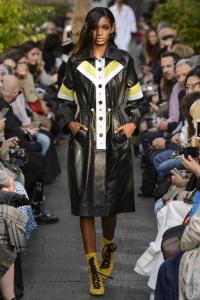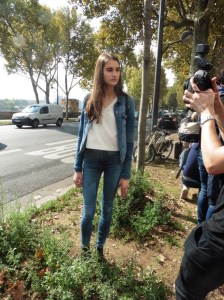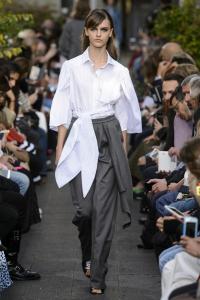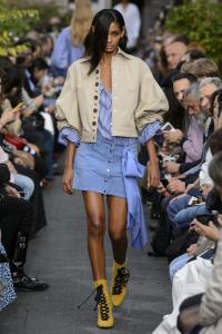 DEFILE VICTORIA/TOMAS AU PALAIS DE LA FEMME: Les créateurs Victoria Feldman et Tomas Berzins ont présenté une nouvelle collection hautement désirable et parfaitement aboutie. Les tenues aux coupes impeccables sont confortables et pratiques, tout en restant cool et avec de petites touches sexy. Les classiques chemisettes en coton bleu ciel ou kaki à maxi poches sont associées à des mini-jupes. L’incontournable sweater gris clair est agrémenté de volants et se porte « cropped », tandis que les pièces en denim s’enfilent à l’envers, exploitant l’effet de textures et couleurs différents. Tout se joue dans les détails, l’allure étant rehaussée par des franges fines ou des éléments métalliques, comme les boutons pression, les oeillets ou les chaînettes qui bordent certains vêtements. Ici, de longues fentes verticales traversent des pantalons ou des vestes-capes. Là, des ouvertures se créent sur les flancs ou les cuisses dans des tee-shirts ou jupes froncées. Le serpent, symbole de fertilité, s’enroule en broderies et applications sur jupes et vestes. Aux pieds, de solides bottes en cuir noir plates, pour plus de confort.